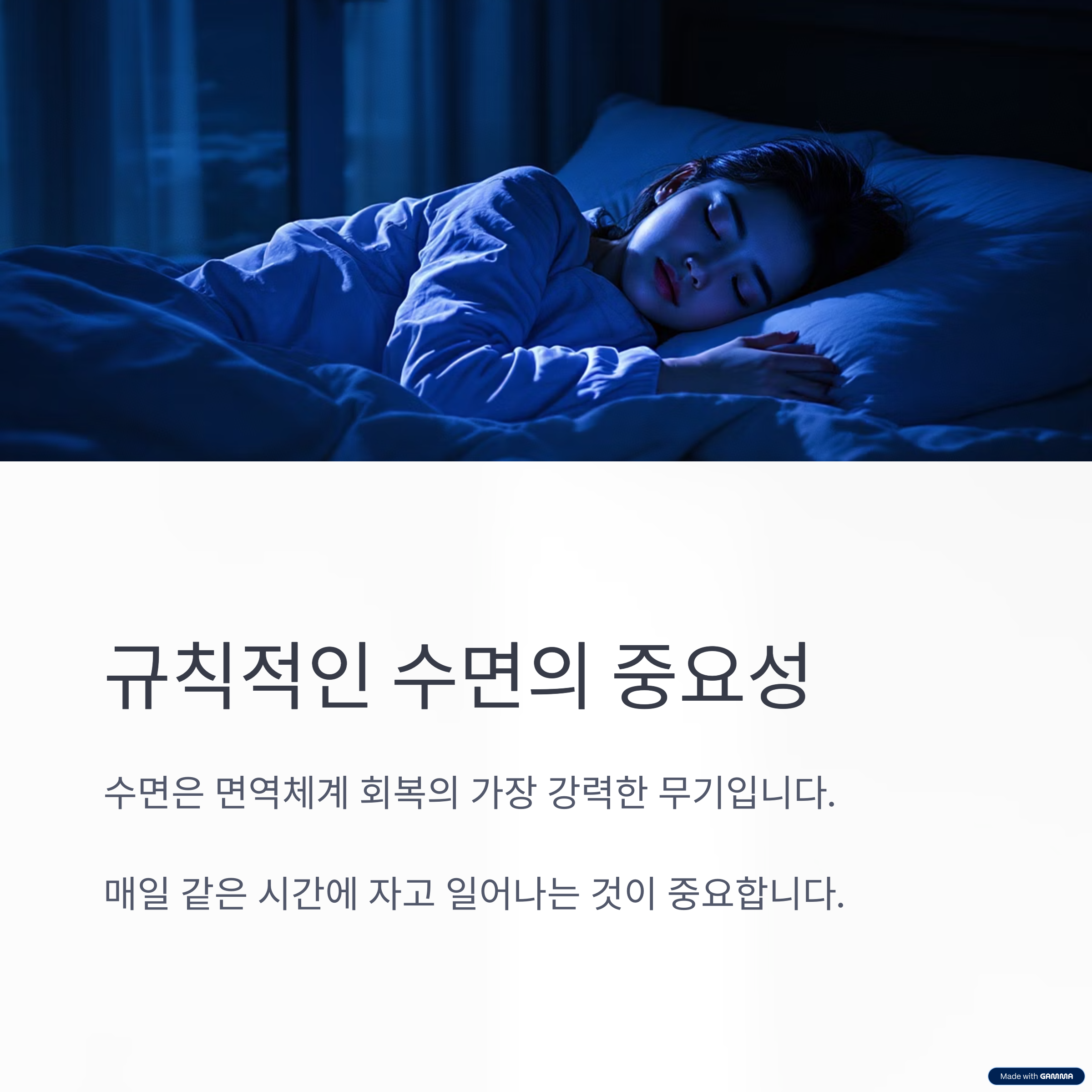 규칙적인 수면은 면역력을 회복시키는 핵심 요소입니다. 매일 같은 시간에 자고 일어나는 것은 우리의 생체 리듬을 일정하게 만들어, 면역 기능을 최상으로 유지하게 합니다. 또한 장 건강은 생각보다 훨씬 더 중요한 역할을 합니다. 장에는 면역세포의 70% 이상이 모여 있어, 평소 발효식품이나 식이섬유 섭취가 부족하면 면역 체계가 흔들릴 수 있습니다.