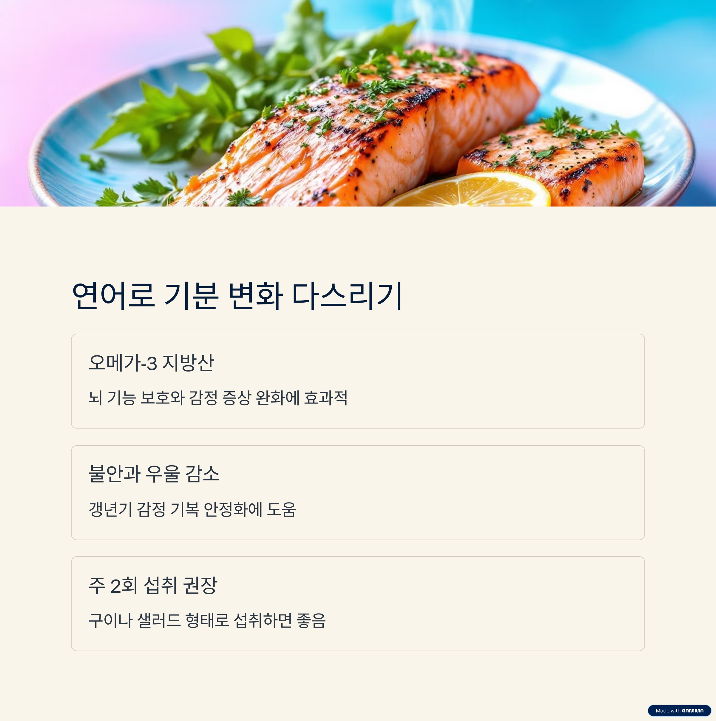 | 연어 | 오메가-3 지방산 | 감정 기복 완화, 수면 질 개선 |