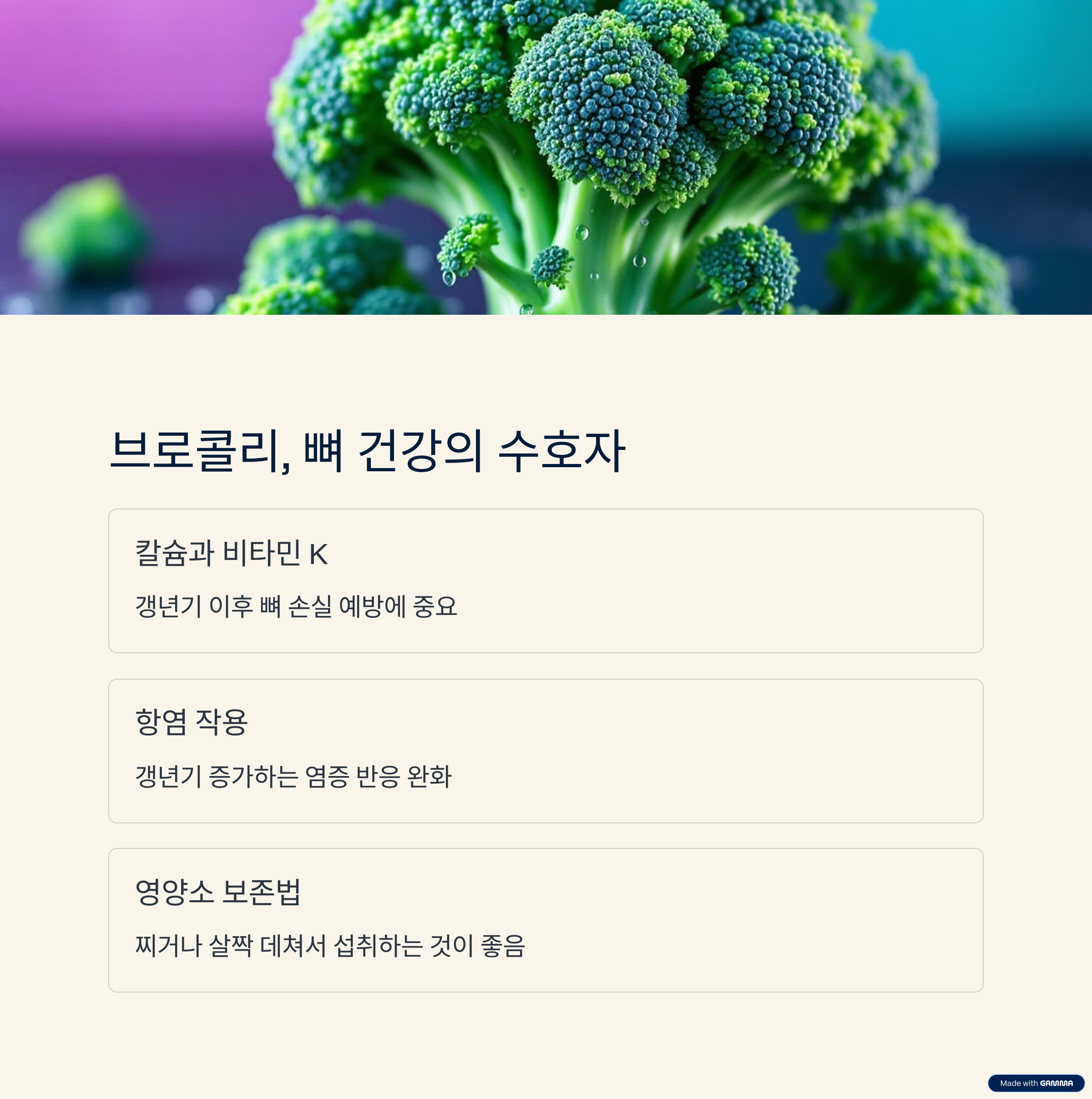 | 브로콜리 | 칼슘, 비타민 K | 뼈 건강 증진, 염증 완화 |
