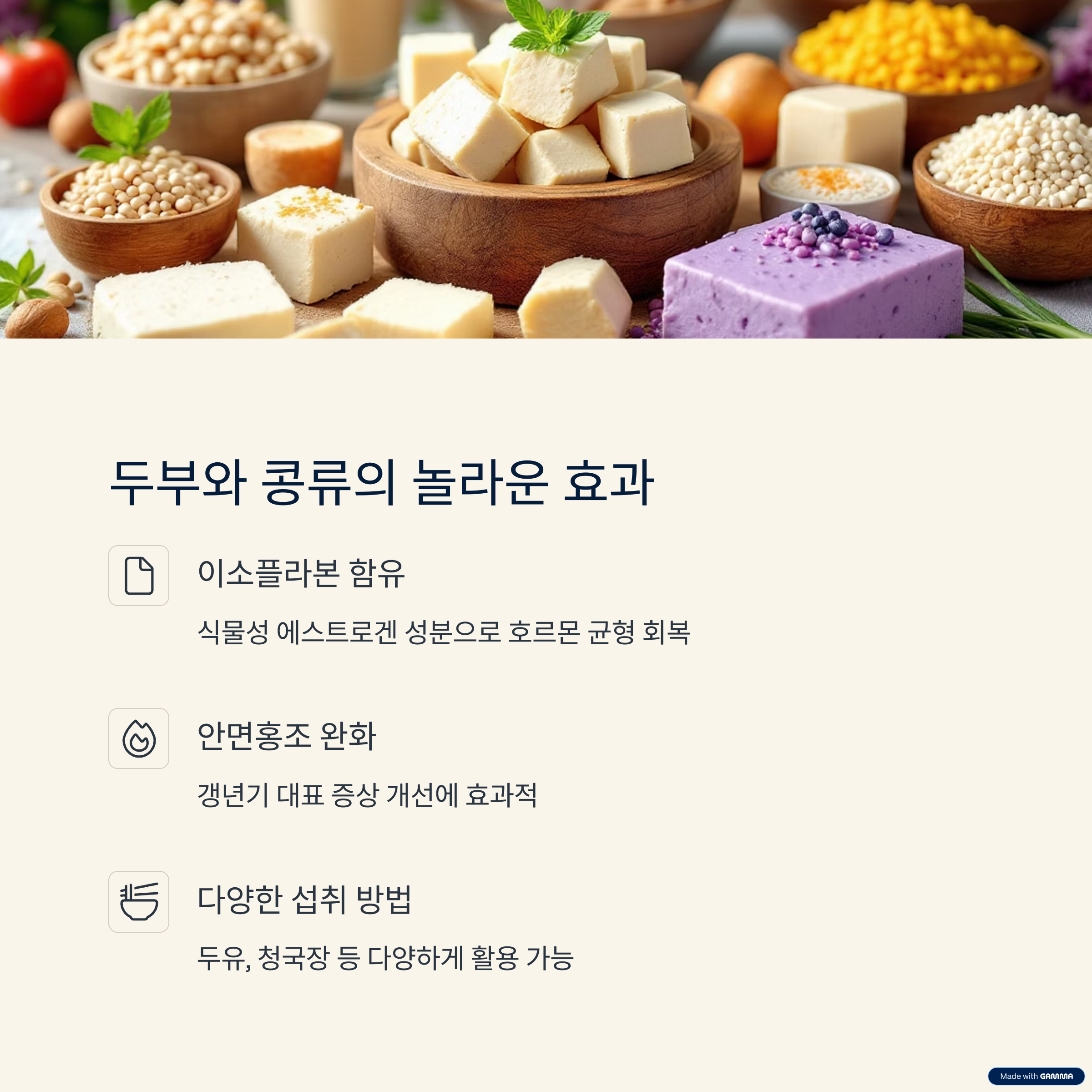 두부와 콩에는 이소플라본이라는 식물성 에스트로겐 성분이 풍부하게 들어 있습니다.