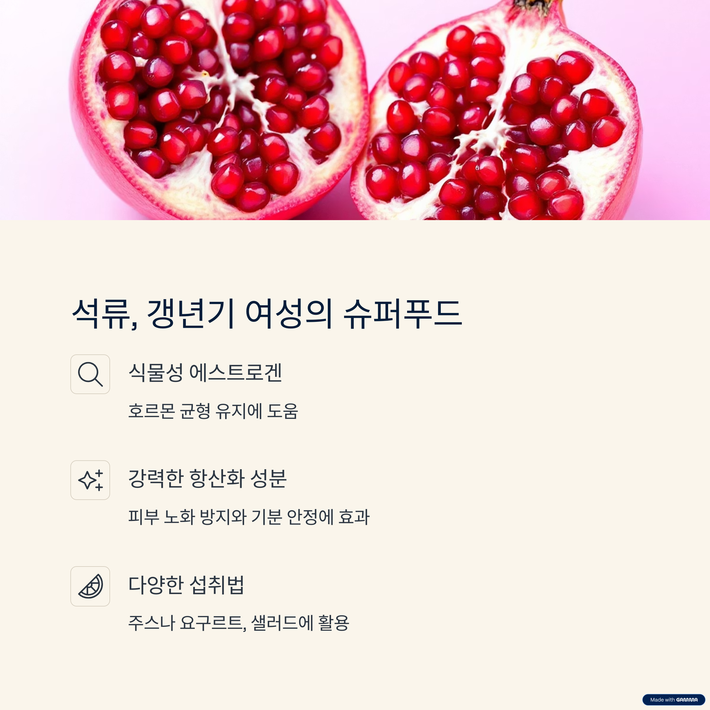 | 석류 | 식물성 에스트로겐, 항산화 | 피부 탄력 유지, 기분 안정 |