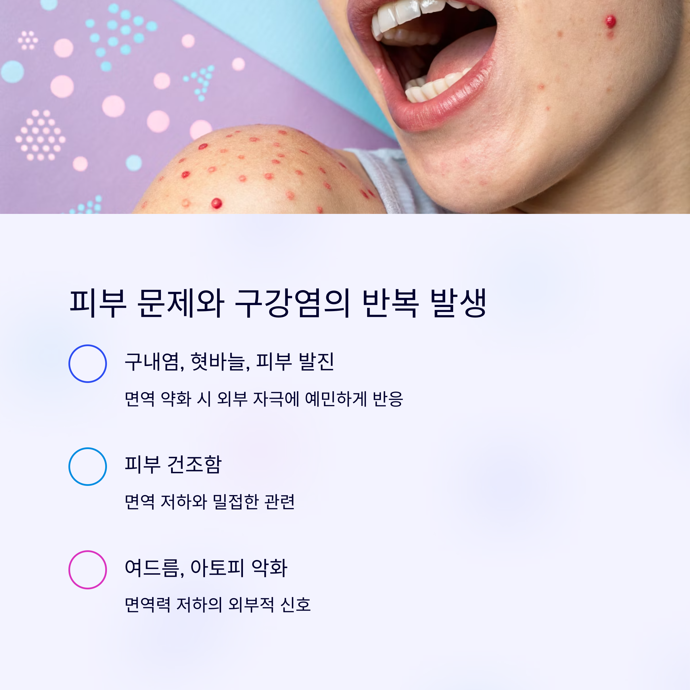 건조함, 여드름, 아토피 악화도 면역 저하와 밀접한 관련이 있습니다