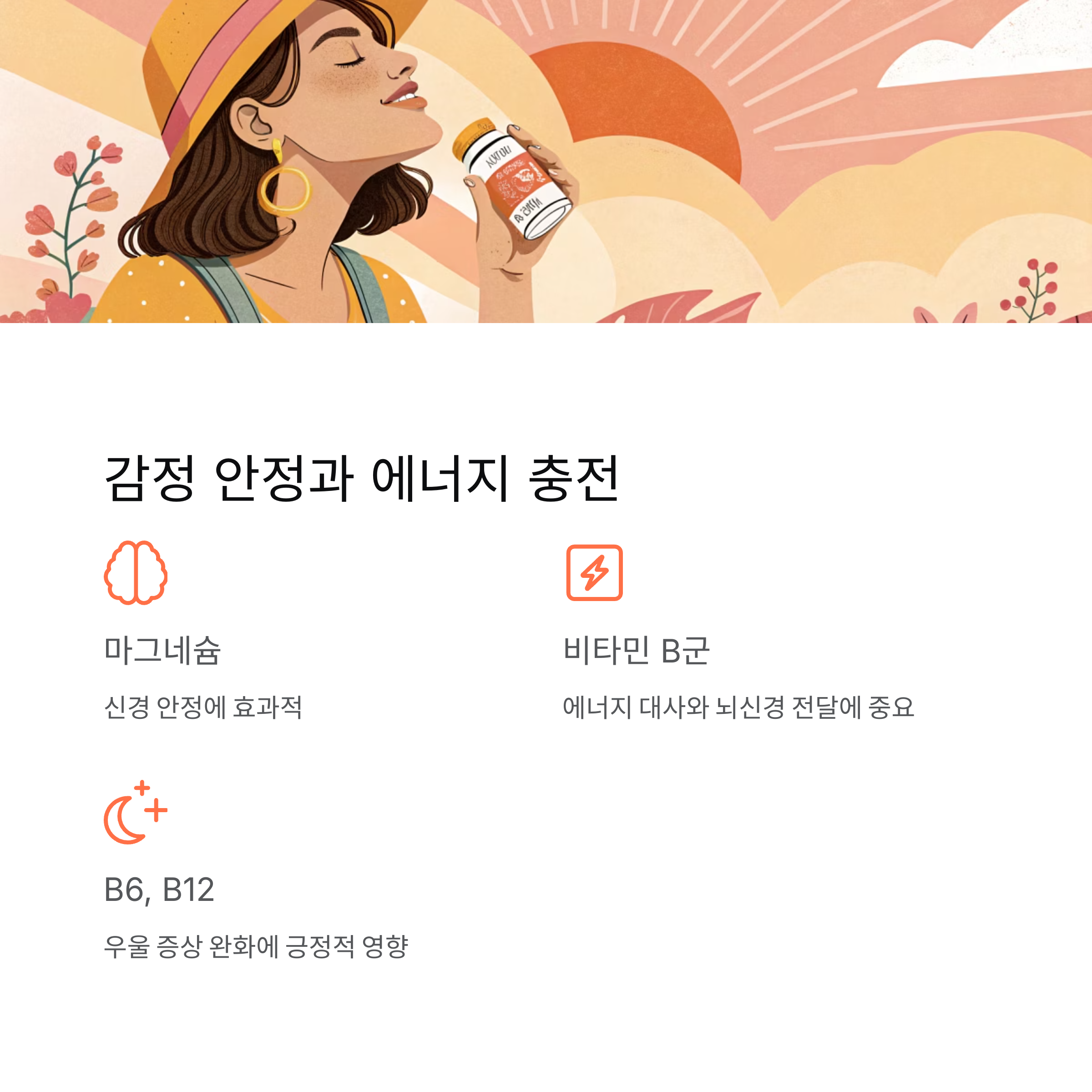 | 우울감, 감정 변화 | 비타민 B군, 오메가3 | 신경 안정과 에너지 개선 |