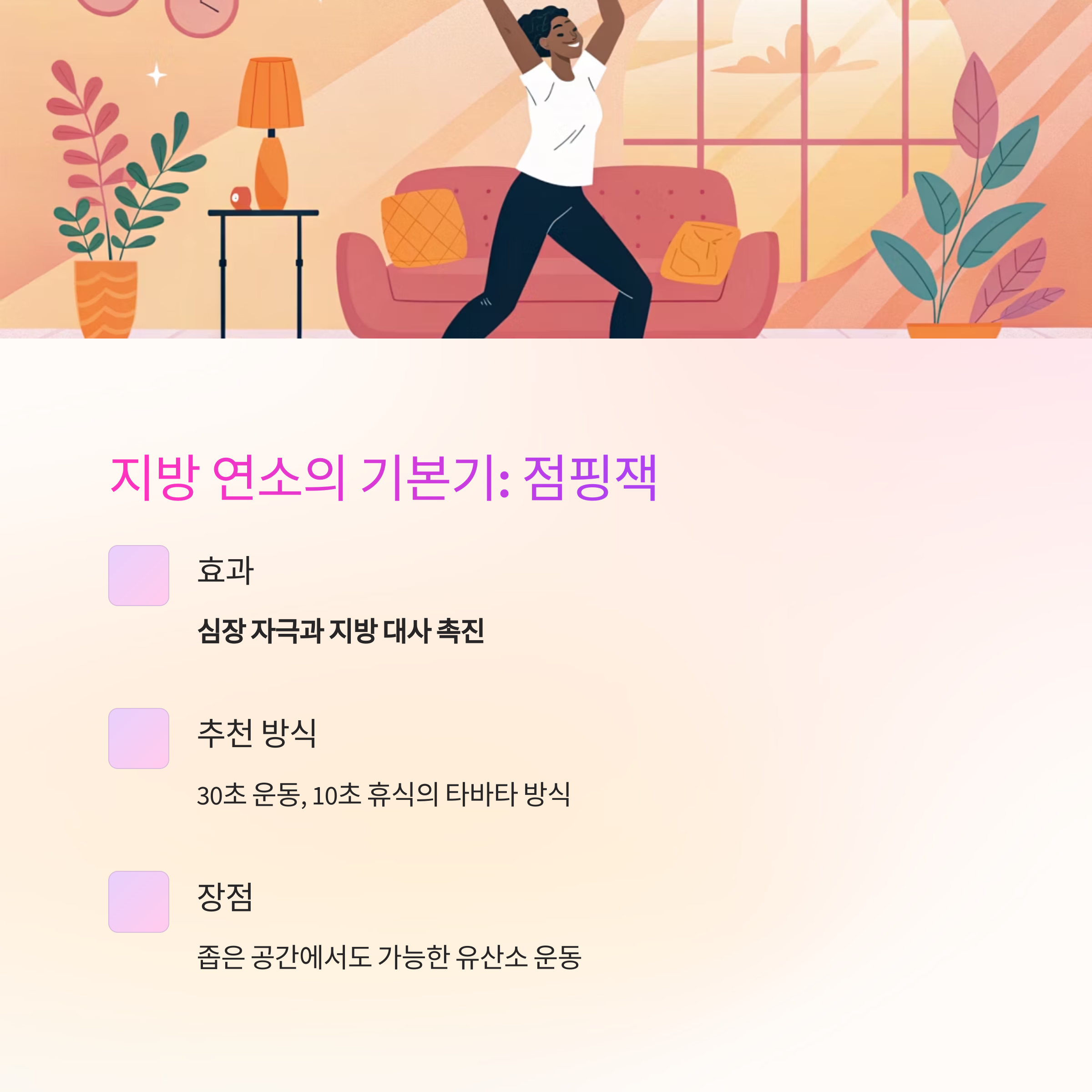 지방을 효과적으로 태울 수 있는 집에서 가능한 운동법을 소개합니다.