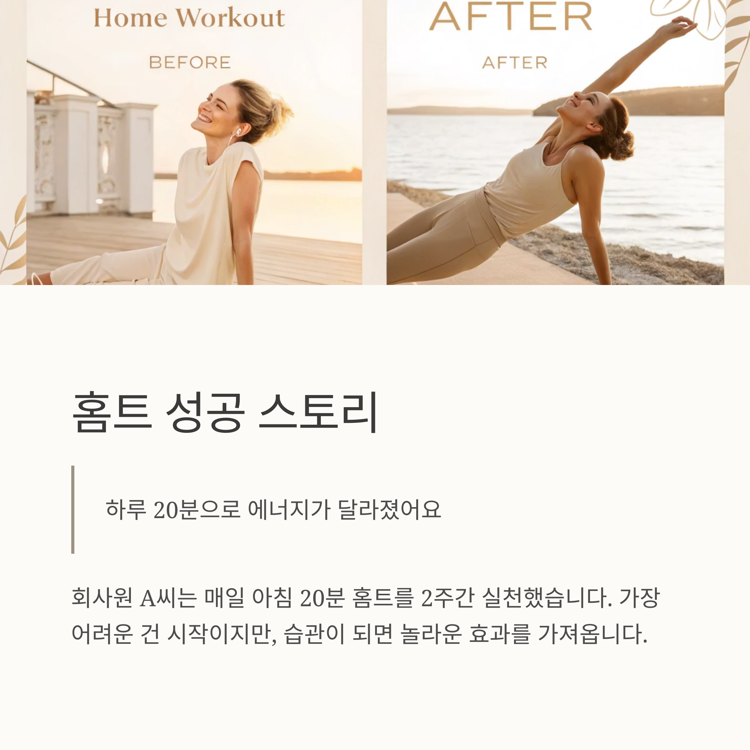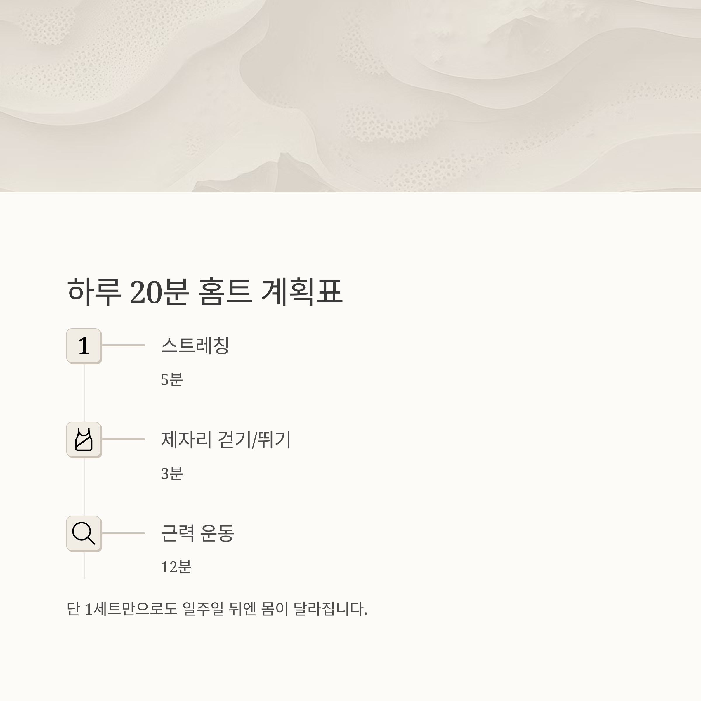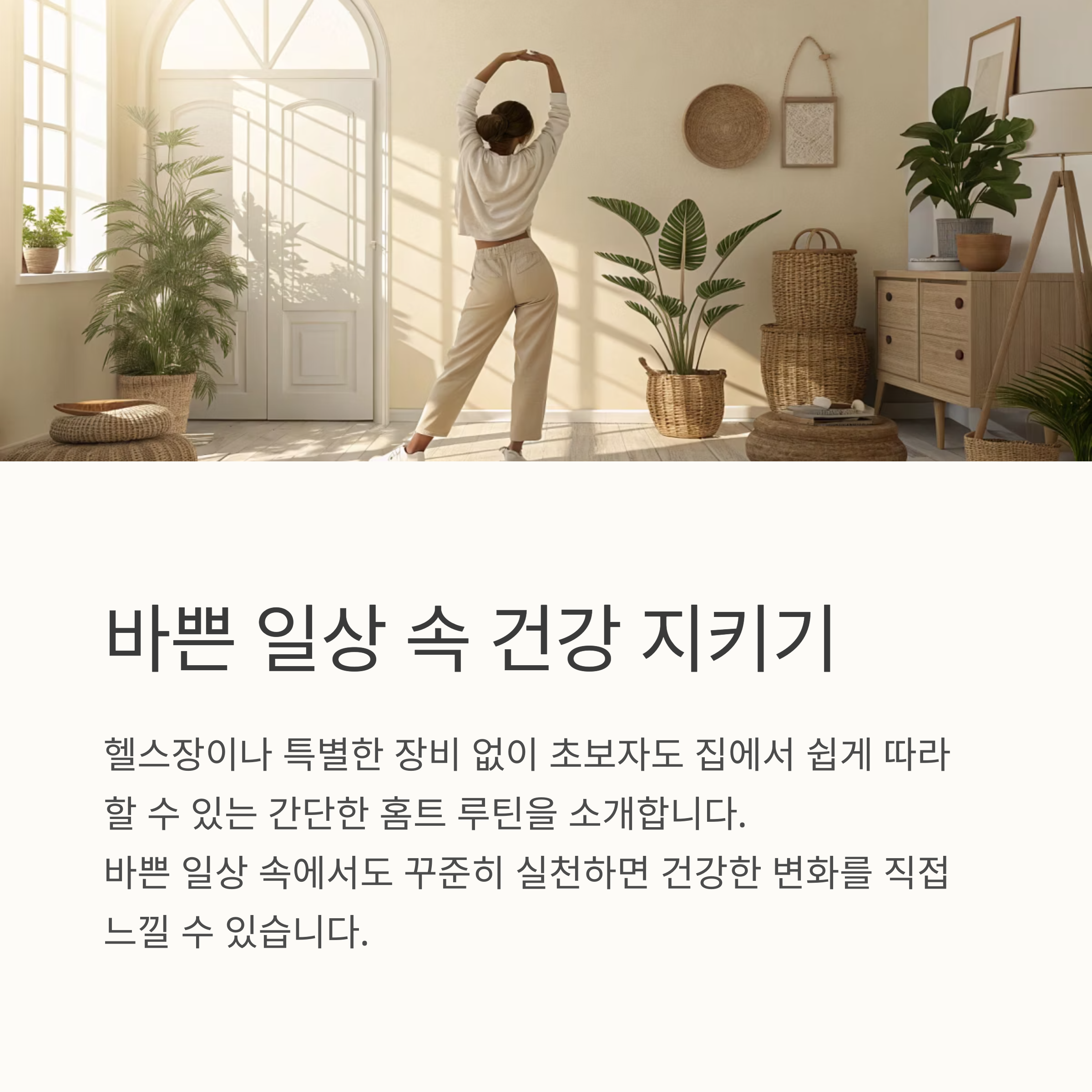 특별한 장비 없이도 집에서 따라 할 수 있고, 꾸준히 하면 몸의 변화를 직접 느낄 수 있습니다.