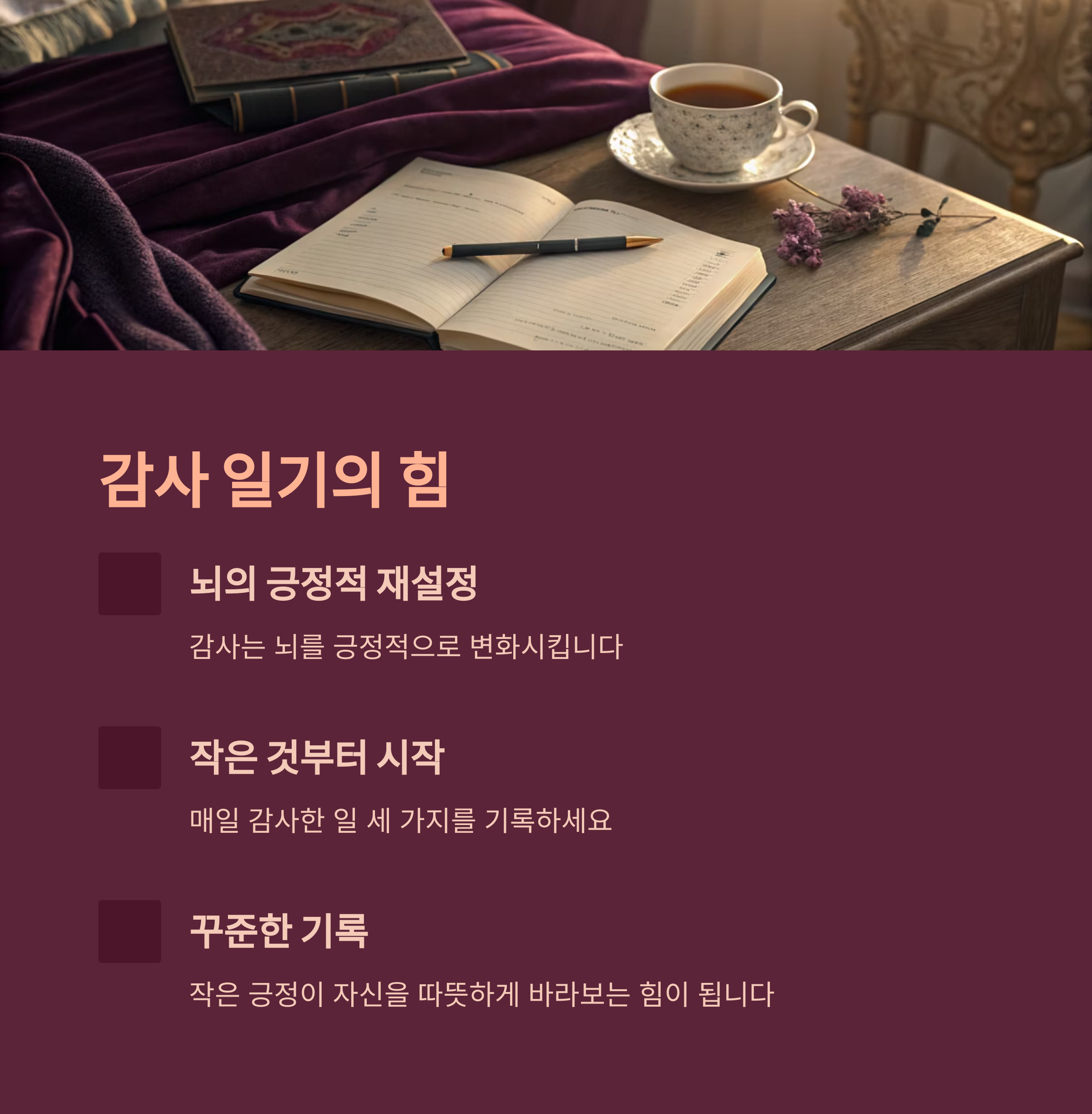 매일 자기 전, 감사한 일을 세 가지 적어보세요.